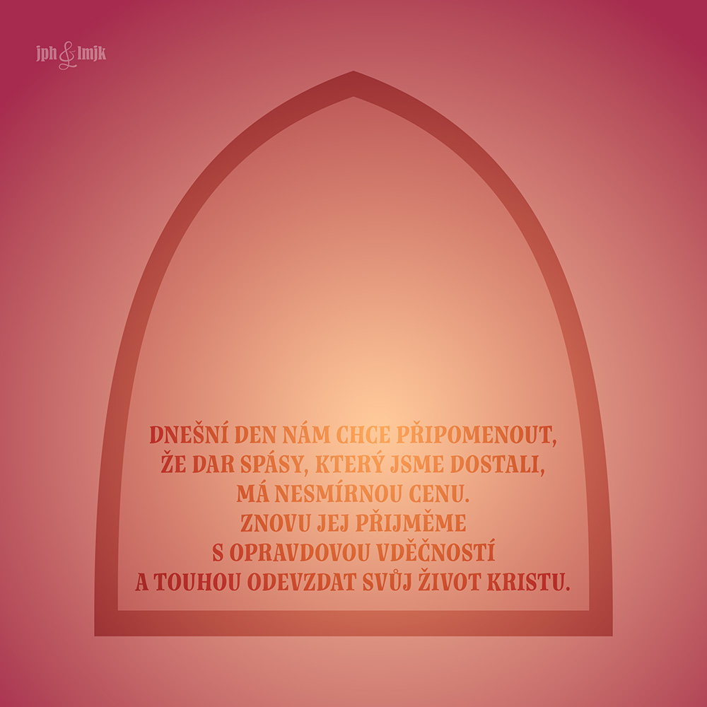 Druhá myšlenka. Když dostaneme nějaký dar, máme z něho radost. Víme, od koho je, víme, že nám chtěl udělat radost… ale mnohem více si ho budeme vážit, když si uvědomíme, jakou má hodnotu. Před námi je obnova daru spásy. Prožijeme ji večer na Zelený čtvrtek ve večeřadle, na Velký pátek pod křížem a v nedělní noci u otevřeného Kristova hrobu. A dnešní den, dnešní čtení Pašijí nám chce ukázat a připomenout: Nezapomeň, dar, který jsi dostal, má nesmírnou cenu! Prožij tyto dny s opravdovou vděčností a touhou znovu Ježíši odevzdat svůj život.