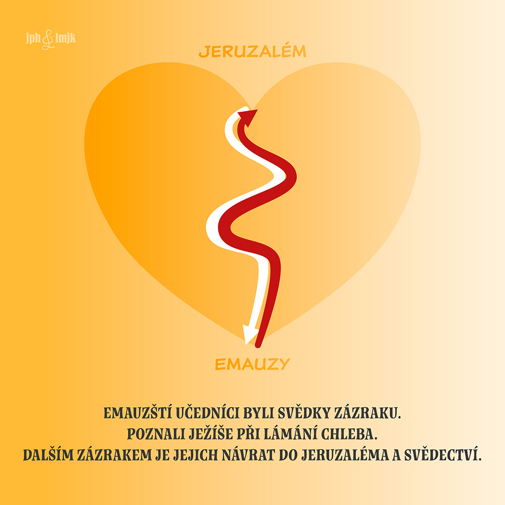 Dnes už společenství církve nestačí odpovědi katechismu, ale příběhy našich osobních životů. Přijměme tedy pozvání dnešní evangelijní události, která nás zve k dalšímu zázraku. Abychom po naslouchání Písmu, rozhovoru s Ježíšem zakusili, že nám hoří srdce. A to krásné, co prožíváme, si nenechali pro sebe. A právě tady nastává to „lámání chleba“, okamžik, který odhaluje pravdu o tom, jak na tom se svým vztahem s Kristem jsme. Jestli jsme zklamaní, zahořklí učedníci na cestě pryč od ostatních, nebo Kristem zapálení apoštolové, posilující společenství církve.