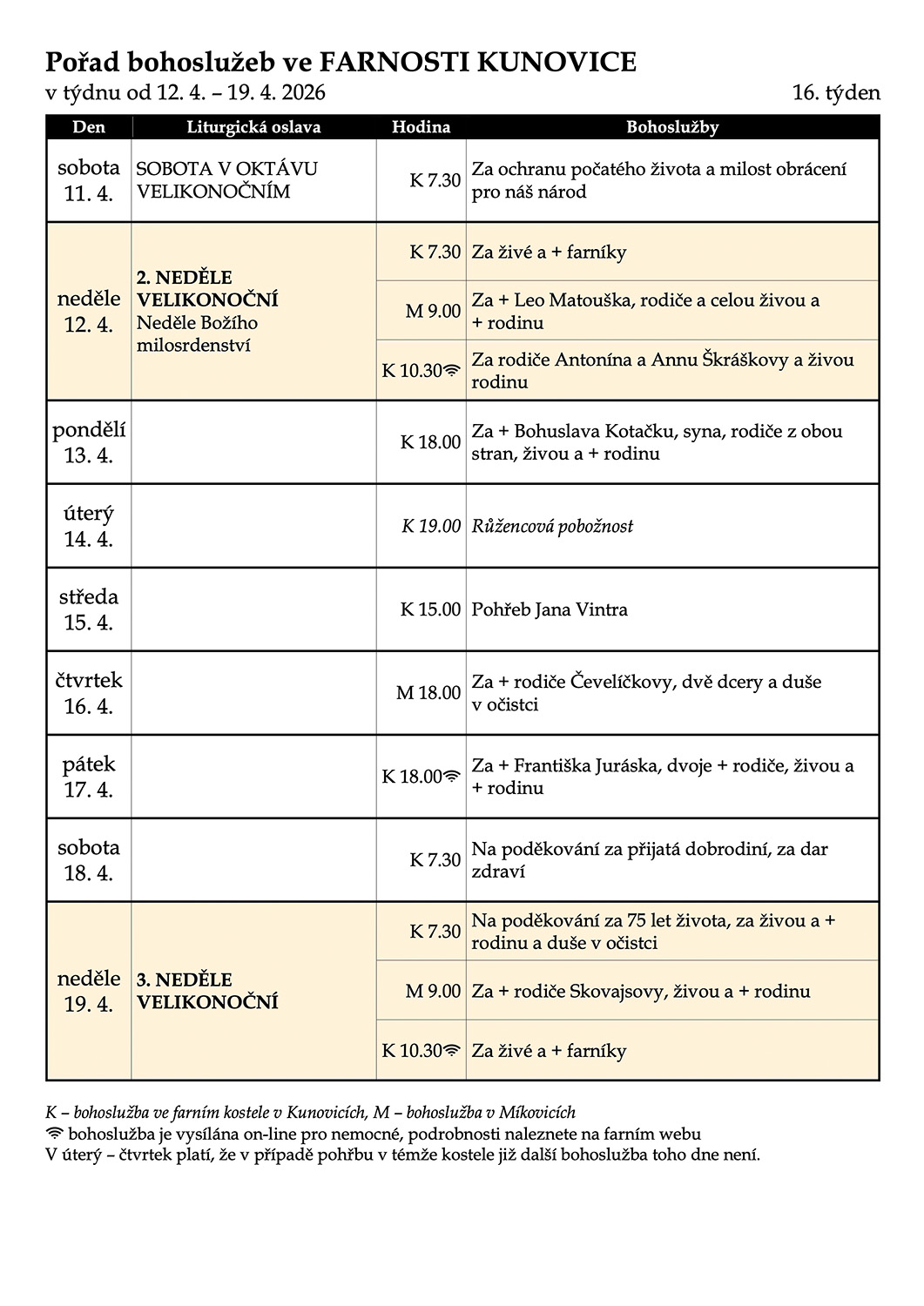 - V pondělí 13. dubna 2026 v 19.00 hodin na farním domečku se koná přípravné setkání pro prvokomunikanty a rodiče.
