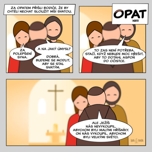 Za opatem přišli rodiče, že by chtěli nechat odsloužit mši svatou. „A na jaký úmysl?“ zeptal se opat. „Za polepšení syna,“ odpověděli. „Dobrá, tak se budeme modlit, aby se stal svatým,“ řekl na to s úsměvem opat. „To není potřeba,“ odtušili rodiče, „stačí když nebude moc hřešit, aby to aspoň do očistce dotáhl!“ Opat se na ně překvapeně podíval: „Ale Ježíš nás nespasil pro to, abychom byli malí hříšníci. On nás vykoupil, abychom byli velcí světci! On nás nepřišel uvést do očistce, ale do nebeské slávy!“